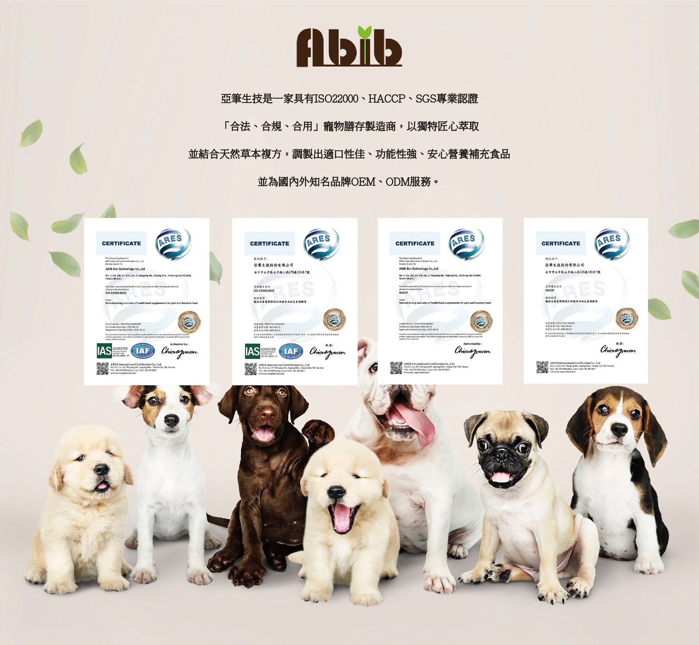 亞筆生技專注於寵物營養與健康配方的開發,整合台灣在食品科技與保健原料的優勢,以專業代工與研發實力,協助品牌打造出安全、有效又具市場競爭力的產品。